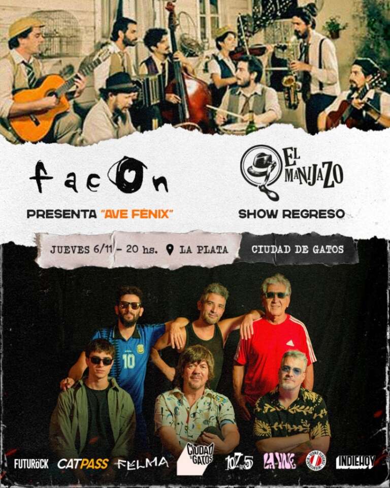 El jueves 6 de noviembre de 2025 actúan en Ciudad de Gatos (C. 71 1099, La Plata) dos formaciones con identidad fuerte: por un lado Facón, que presenta su nuevo disco Ave Fénix mientras…