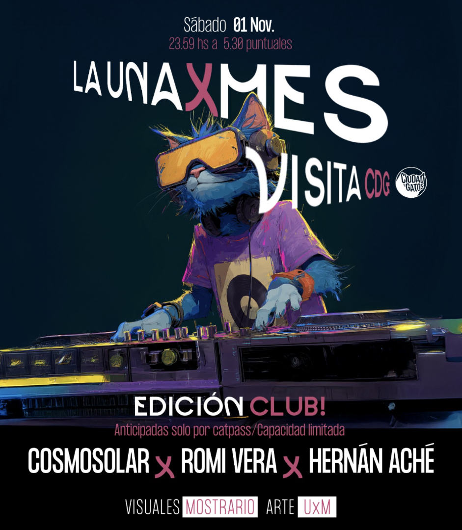 La noche del sábado 1 de noviembre llega a Ciudad de Gatos en La Plata una nueva entrega del ciclo UNA x MES. El line-up de esta edición sitúa en el escenario a Cosmosolar, Romi Vera y Hernán Aché en formato club, mientras el público accede a través de la plataforma Catpass con cupo reducido. El evento da inicio justo a las 23:59 y se extiende hasta las 5:30 de la mañana. La propuesta se enmarca en un espacio que combina música hedonista con ambiente cultural, y que desde sus comienzos se ha perfilado como referencia de la escena local platense.